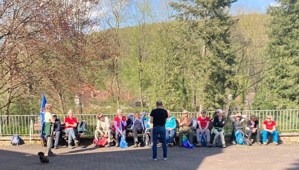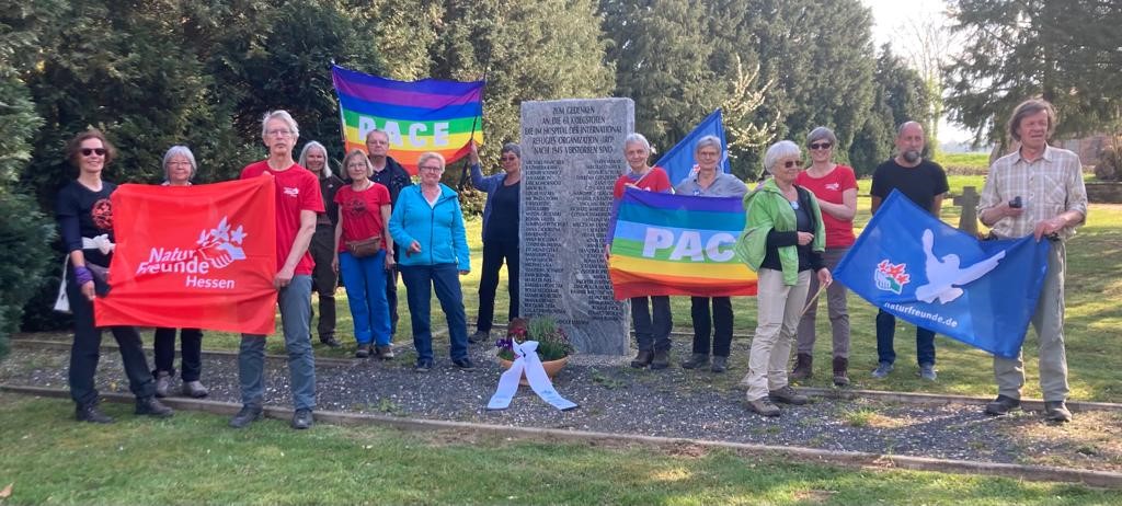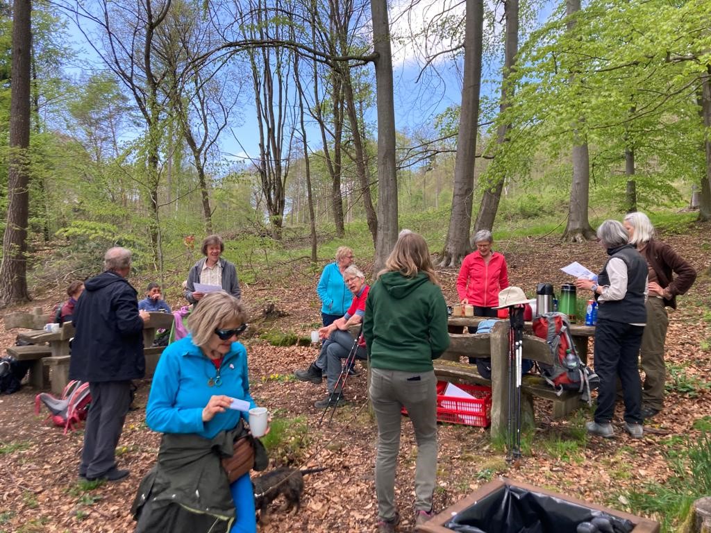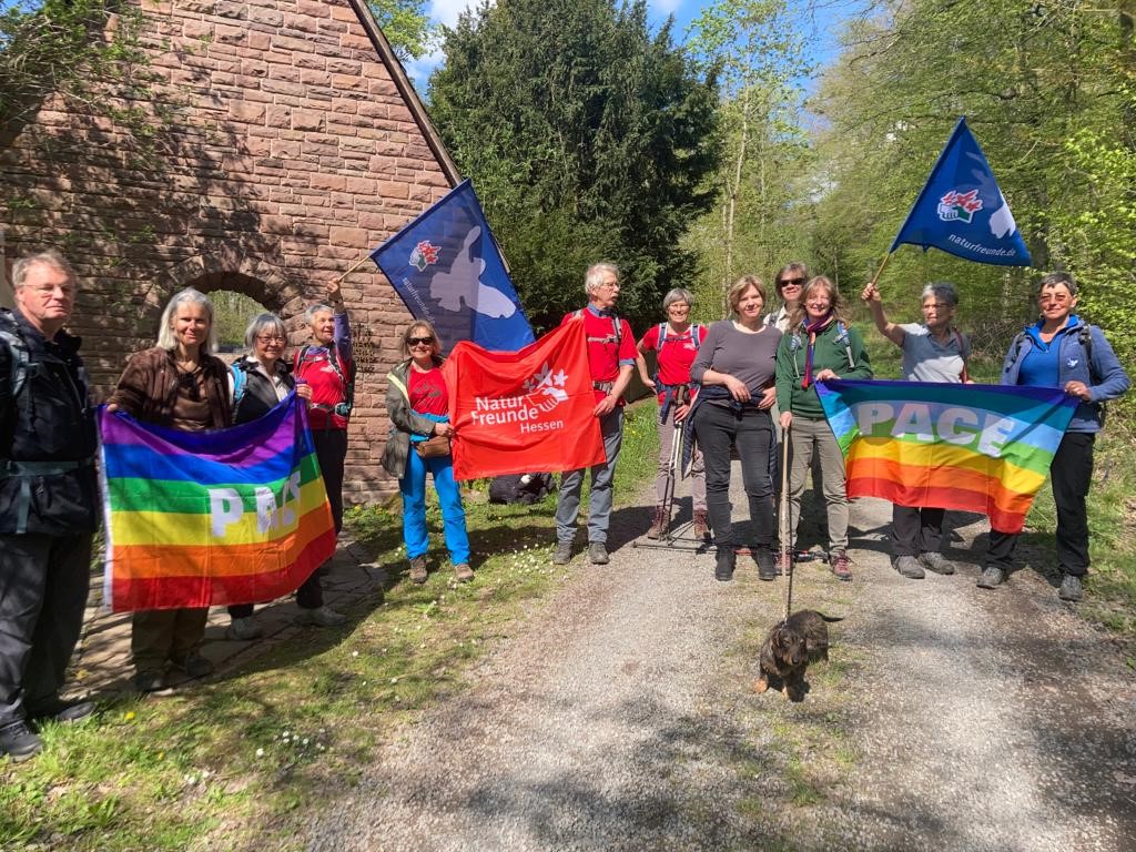 Vergangene Woche war eine Gruppe Wanderer aus Mittel- und Südhessen vom Sportverein der Naturfreunde Hessen auf dem Habichtswaldstieg unterwegs. Sie erwanderten dabei im Rahmen der bundesweiten Aktionstage „Gemeinsam für globale Abrüstung und Frieden“ den EcoPfad „Erinnern und Gedenken“ in Breuna mit Besuch eines jüdischen und eines Kriegsgräberfriedhofs. Am 2. Tag ging es dann von Zierenberg bis Bad Emstal, wo sie Gedenkstätten des Ecopfades „Friedenspädagogik“ aufsuchen wollten. Simone, Jutta und ich haben sie zuvor am Parkplatz der Altenburg mit Kaffee und Kuchen empfangen und sind das Teilstück nach Merxhausen, vorbei an der Kriegsgräberstätte, mit gewanderten. Auf dem Friedhof in Merxhausen informierte sie der 1. Vorsitzenden des Kultur- und Geschichtsvereins Merxhausen, Martin Biskamp, über die früher dort lebenden „Displaced Persons“ und die „Korringenden“ . Es war eine doch recht bedrückende Atmosphäre angesichts des Elends, was sich hinter den Mauern der Landsheilanstalt abgespielt haben muß. Aber Herr Biskamp konnte die Stimmung noch etwas wandeln, als er von modernen Therapien heute für psychisch Erkrankte berichtete.